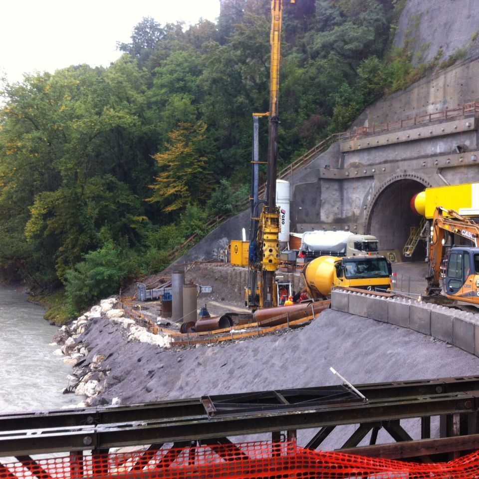 •800m de pieux diamètre Φ=1’000mm, environ 1’200 m2 de palplanches, 10'000 m3 de terrassements.