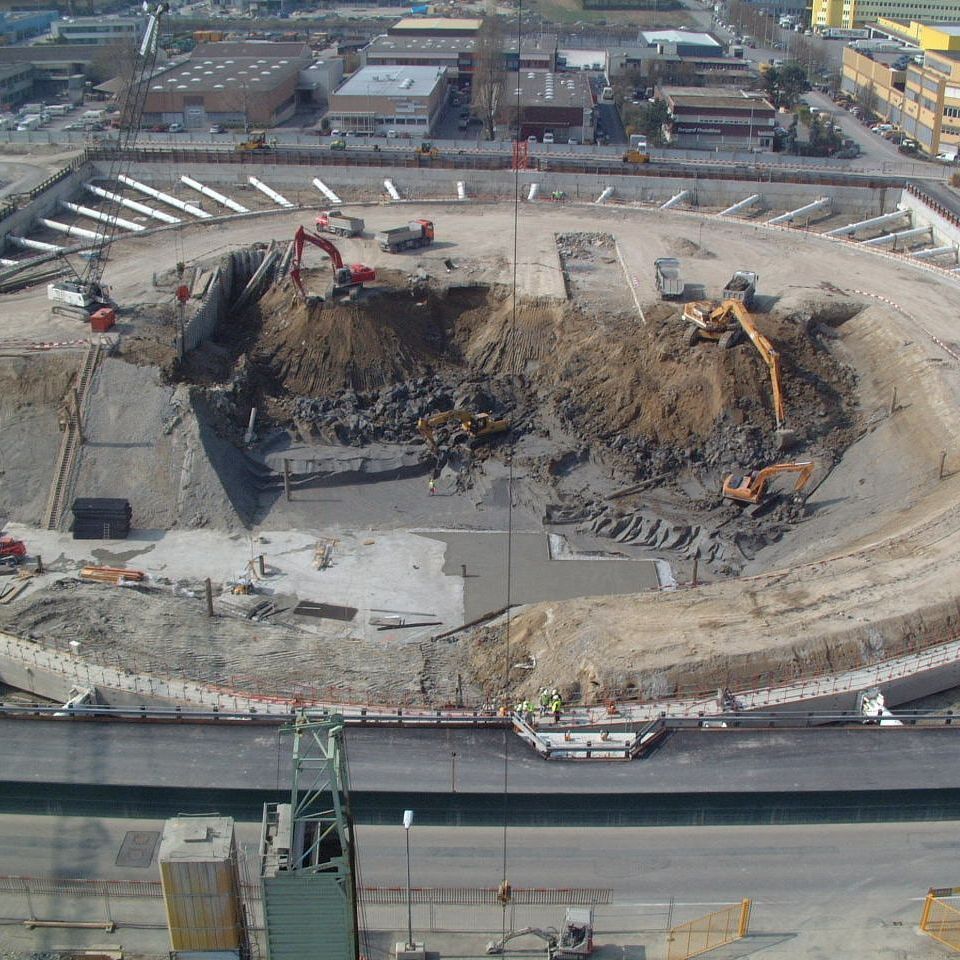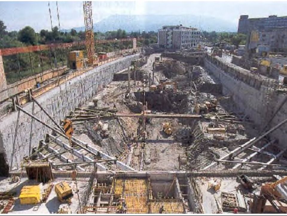 Vue de la fouille au cours du terrassement de la zone centrale et première étape du sous-radier (Avril 2002)