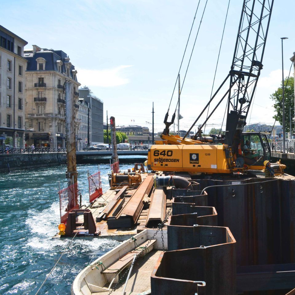 En parallèle avec les travaux de rénovation intérieur du bâtiment et de manière à alimenter le système de climatisation de manière durable, il a été réalisé une prise d’eau dans le Rhône devant le quai des Bergues avec liaison en pousse-tube dans les locaux techniques comprenant le passage sous le collecteur principal rive droite et le mur de quai. La cellule de travail était protégée par un déflecteur en palplanches déviant le courant.